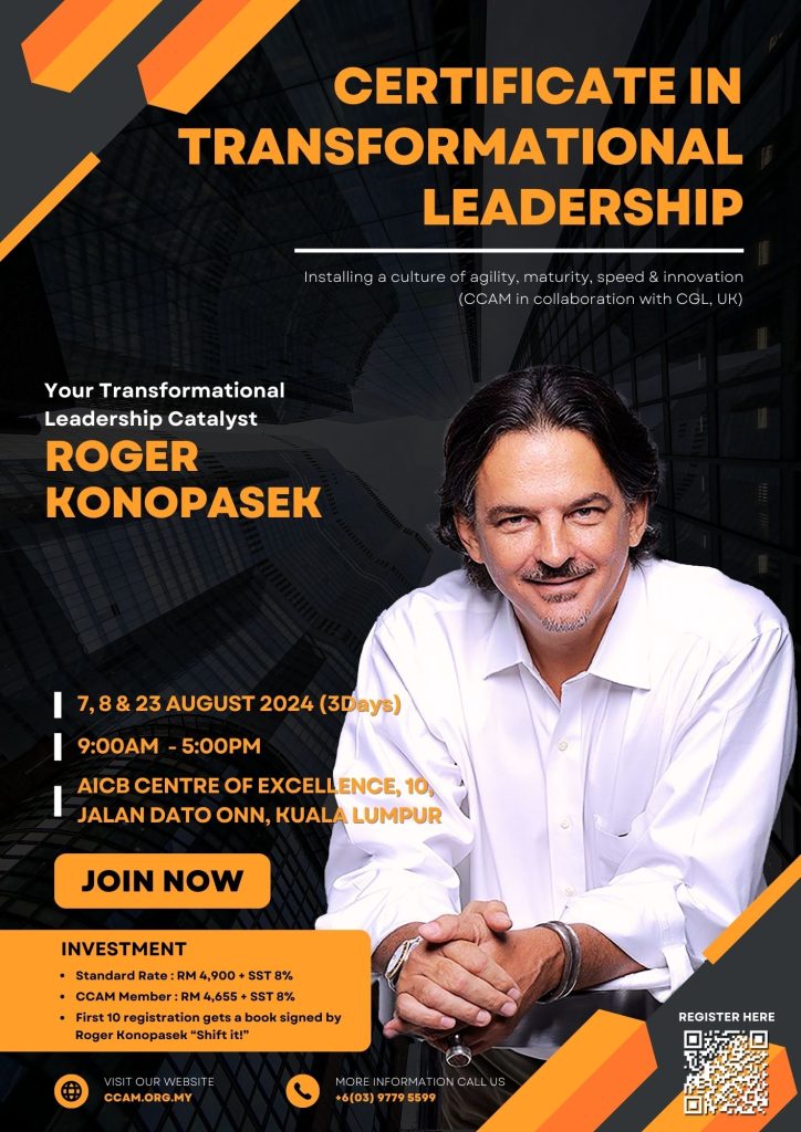 Join Transformational Leadership Catalyst, Roger Konopasek, in this three-day Certification in Transformational Leadership, taking place on the following dates: